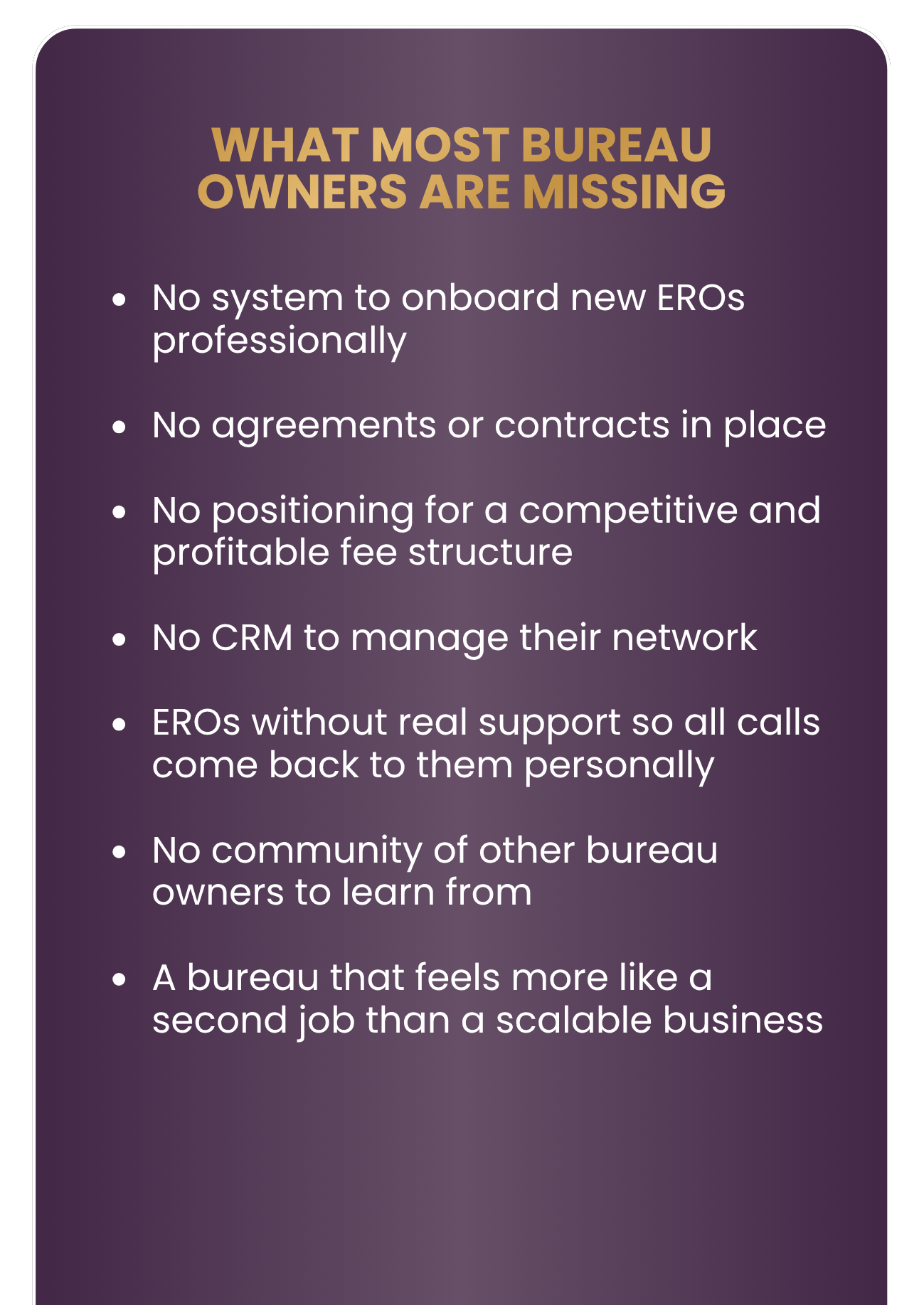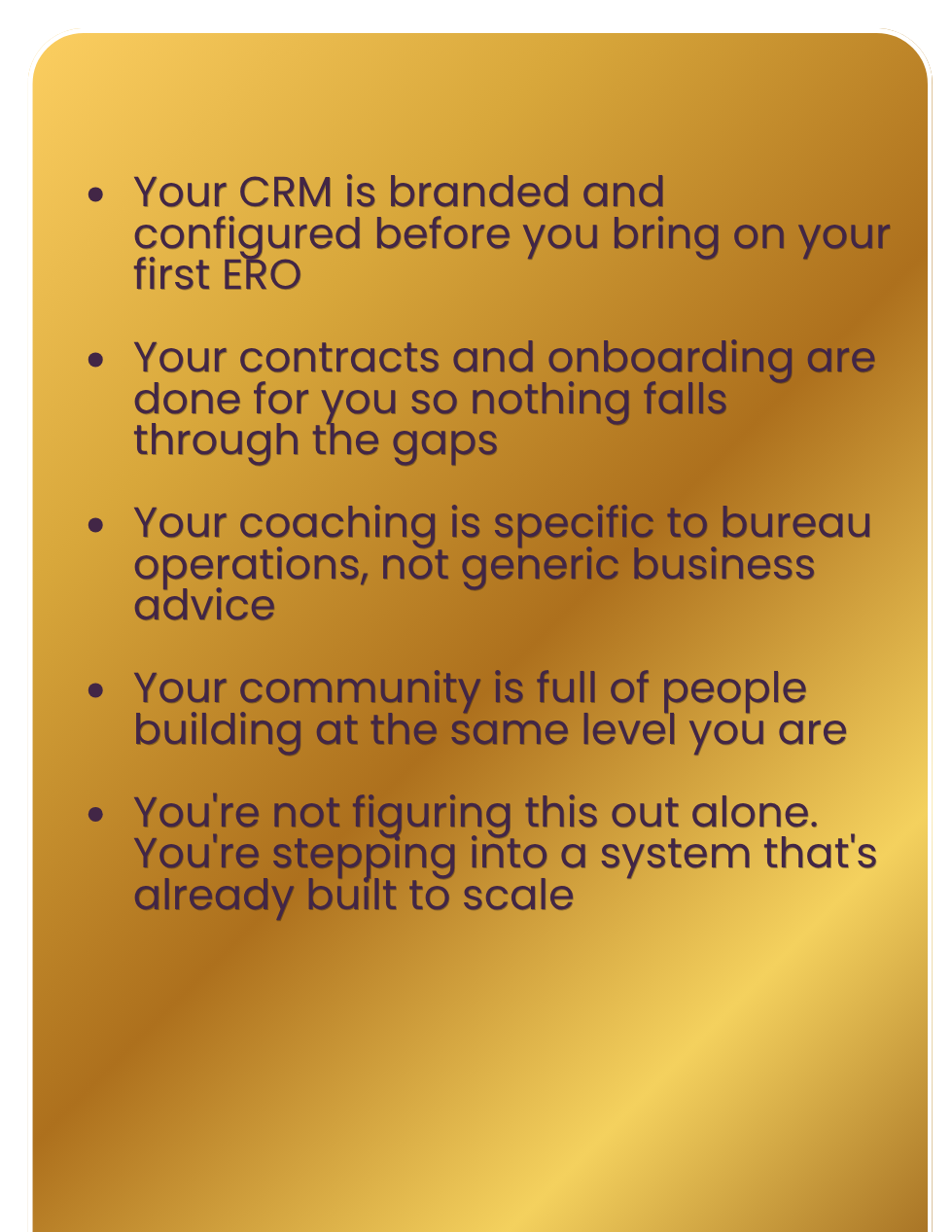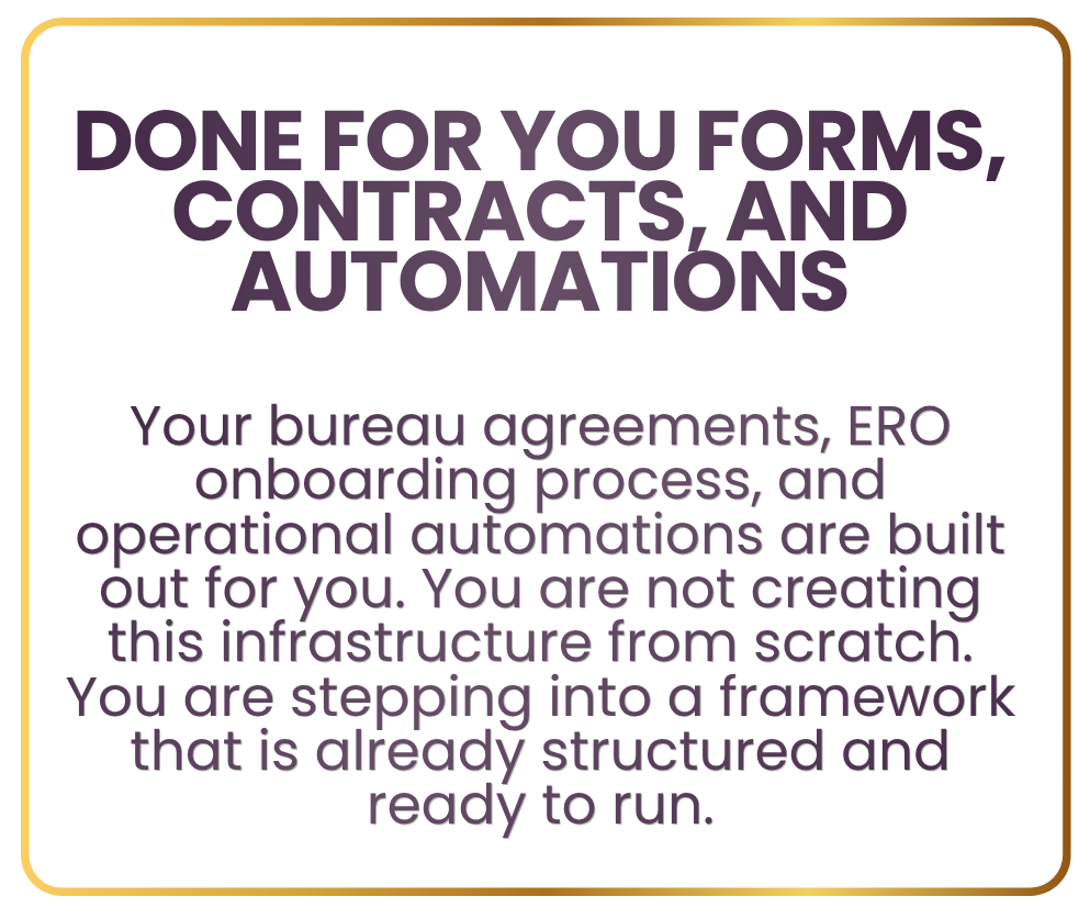 The Service Bureau Blueprint is for established EROs who are done working under someone else's structure and ready to build, scale, and monetize their own network of tax professionals. This is not another plan. This is a business model.