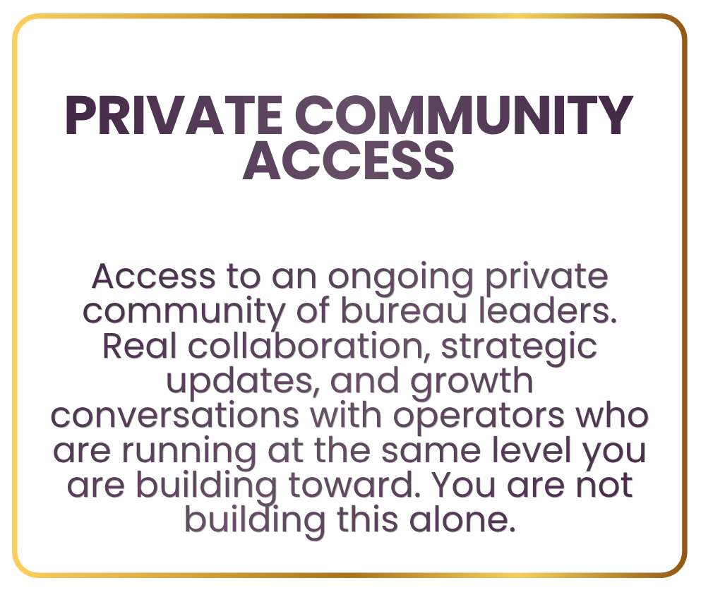 The Service Bureau Blueprint gives you the licensing, the systems, the coaching, and the community to launch and scale your own bureau. No more splitting fees. No more building under someone else's structure. This is yours. It starts with a conversation.